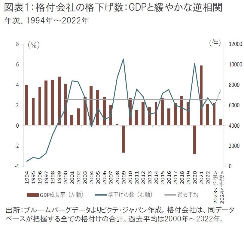格付会社の格下げの数は米国のGDP成長率と緩やかな逆相関がある(図表1)。今後の景気減速を前提とすると、来年は格下げの数が大幅に増加し、2000年以降の平均を上回る可能性が高い。最近の格付の動向と、今後の市場への影響を検証する。