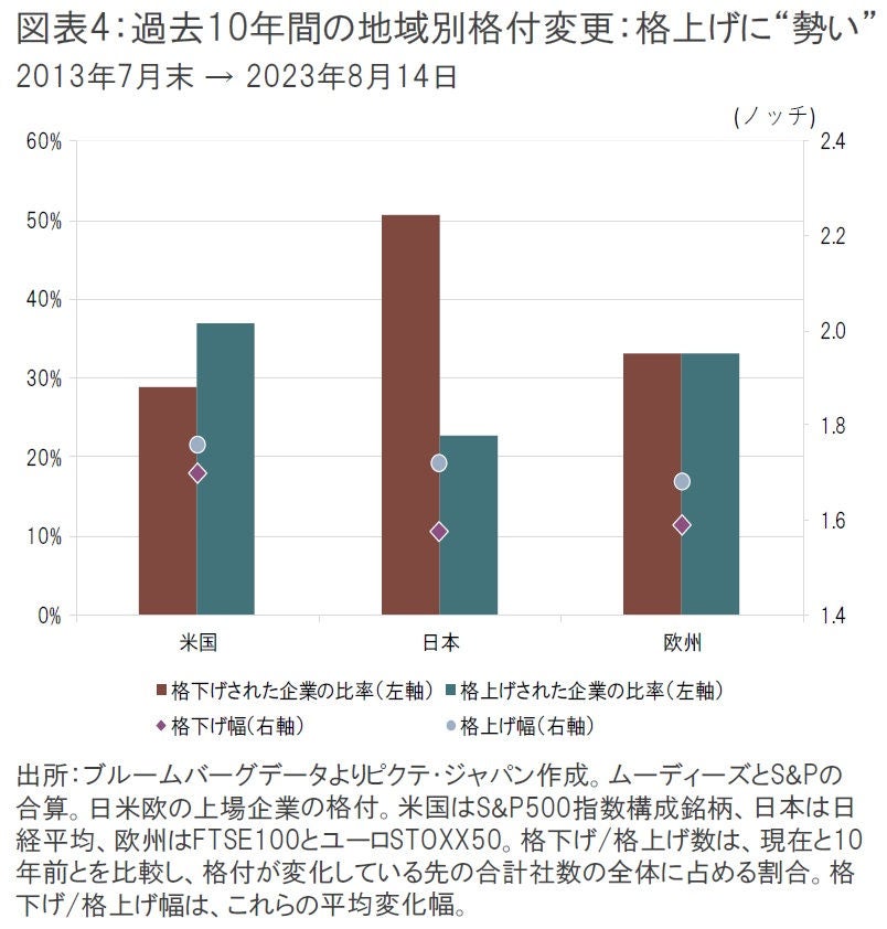 第三に、格上げと格下げの“勢い”の違いがある。10年間で格上げされた企業の平均格上げ幅と、格下げされた企業の平均格下げ幅を比べると、日米欧どの地域でも、格上げ幅が格下げ幅を上回っている(図表4)。