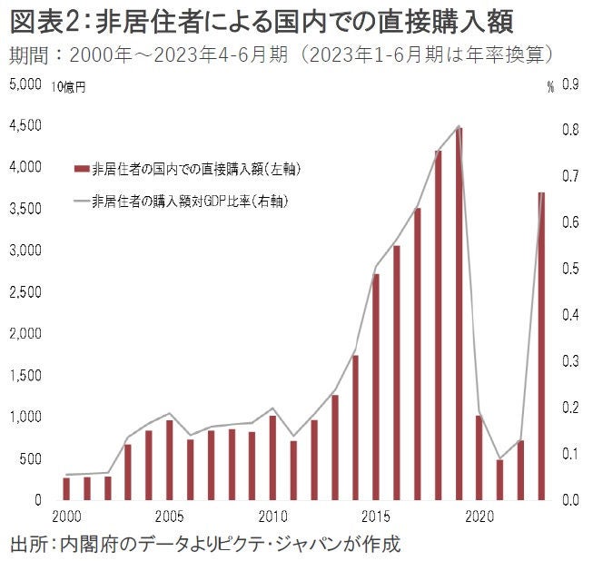 結果として、インバウンド消費、即ちGDP統計上の輸出項目である「非居住者家計の国内での直接購入」は、年換算で3兆6,918億円に達し、2019年の82.6%になった(図表2)。対GDP比率は、2022年の0.1%から0.7%へ7倍に拡大している。