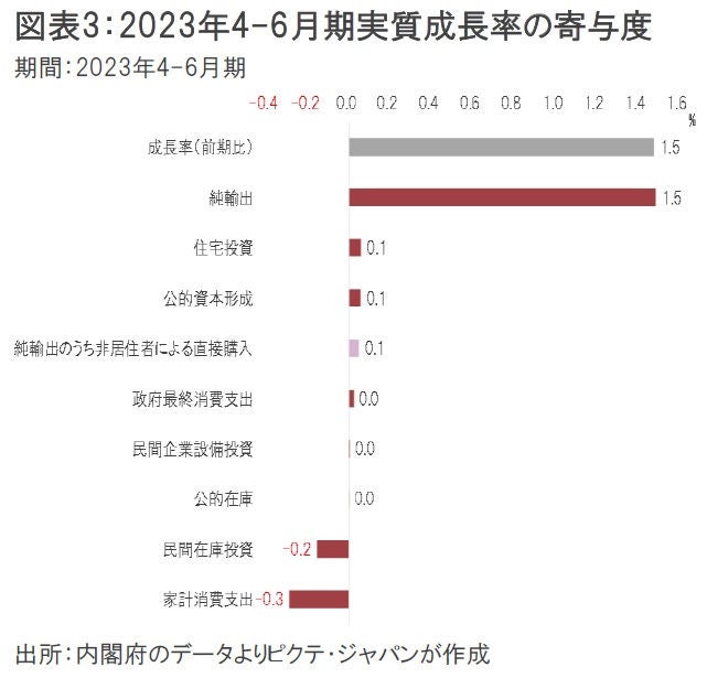 ミクロ的な観点から、訪日外客の回復によるインパクトの大きな産業・企業、そして地域があることは間違いない。もっとも、マクロ的に見れば、インバウンドで日本経済全体を牽引するのは難しいだろう。例えば実質成長率への寄与度は、今年1-3月期が0.2%ポイント、4-6月期は0.1%ポイントに過ぎない(図表3)。仮に訪日外客数が政府の目標とする6千万人になったとしても、GDPの構成では2%に満たない可能性が強いのだ。