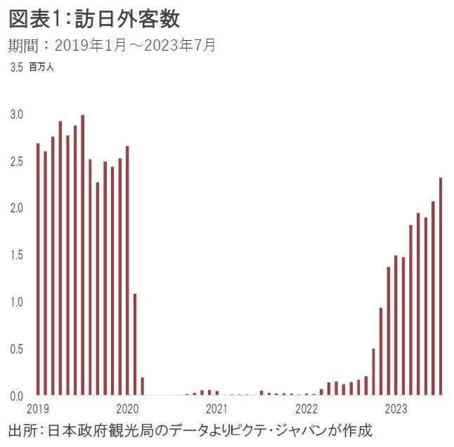日本政府観光局によれば、7月の訪日外客は232万1千人であり、2019年と比べ78.6%の水準となった(図表1)。1-7月の累計では1,303万3千人で、訪日外客が過去最多だった4年前の同時期に対し66.4%まで回復している。
