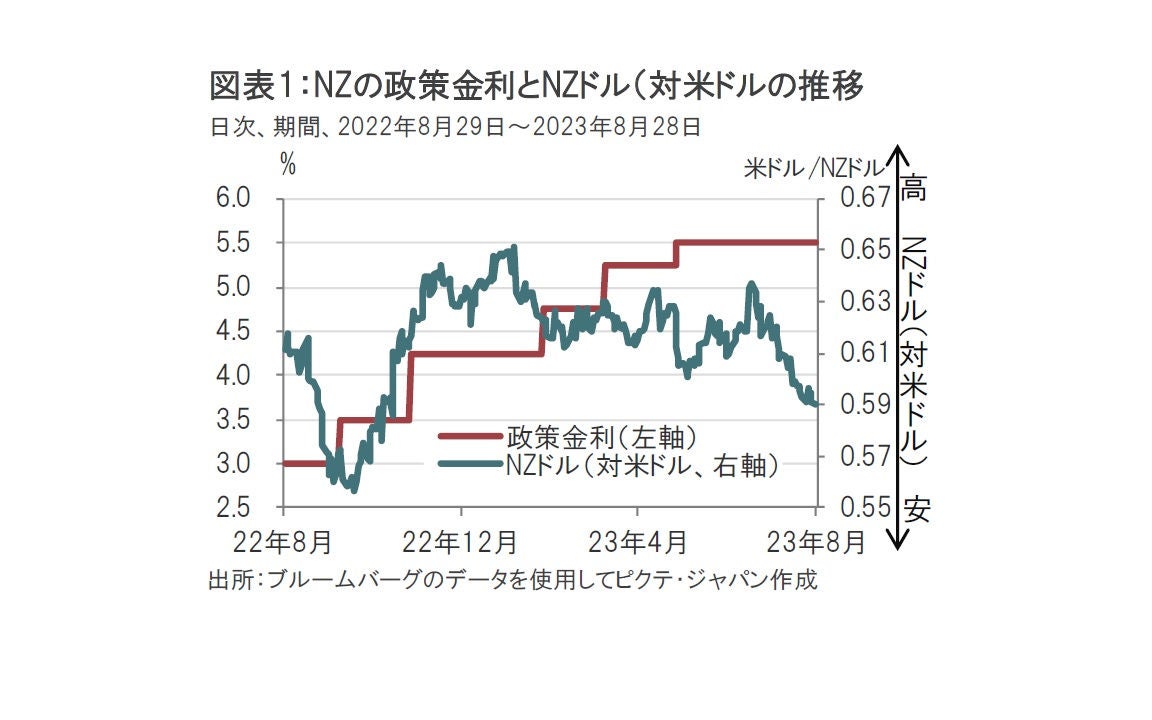 ニュージーランド(NZ)準備銀行(中央銀行)は2023年8月16日に開催した金融政策決定会合(会合)で、市場予想通り、政策金利(OCR)を5.50%に据え置きました(図表1参照)。NZ準備銀行は声明文で、現行水準の政策金利は引き締め水準にあることを指摘するとともに、予見可能な限りはOCRを引き締め水準に据え置く必要があると指摘しています。