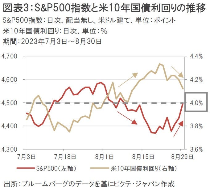 逼迫した労働市場が緩和へ向かえば物価上昇圧力もいずれ低下する、そのような期待が金融市場で広がり、米10年国債利回りは急低下した一方、S&P500指数は急反発した(図表3)。