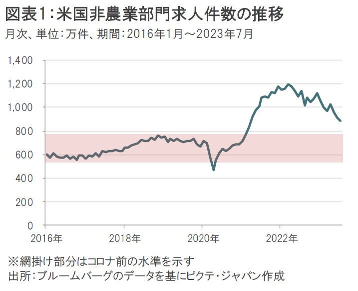 コロナ前の水準が概ね700万件前後であったことを考慮すると、直近の求人件数はまだまだ高水準と言えるが、労働市場の逼迫が徐々に解消しつつある状況がうかがえる(図表1)。