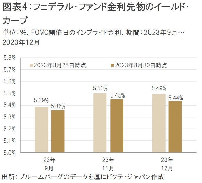 前述した労働市場統計の「ダブル・サプライズ」によって金融市場は大きく反応することとなったが、市場が織り込む11月の米連邦公開市場委員会(FOMC)における利上げ観測は若干後退したに過ぎない。利上げ回数(1回=0.25%)に換算すれば、約0.7回から約0.5回へ低下した程度だ。おそらくFRBの判断材料としては不十分と市場で認識されたのだろう(図表4)。