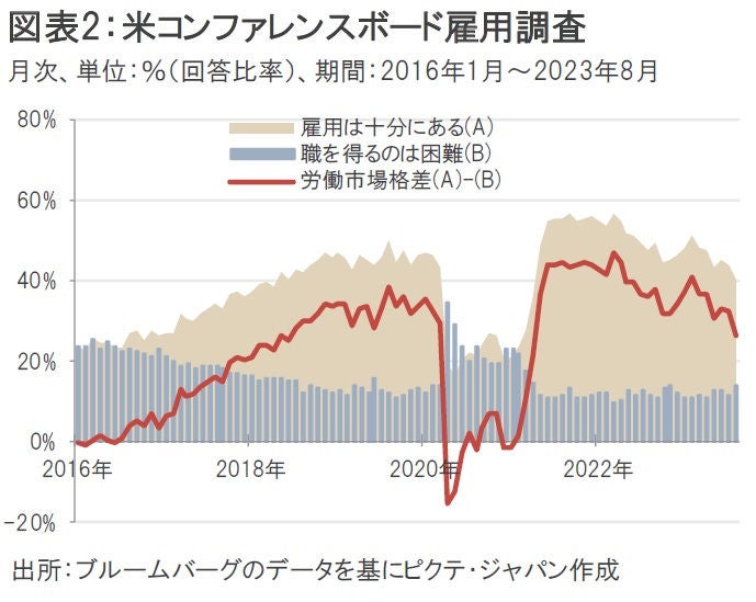 また、同日発表された米民間調査機関のコンファレンス・ボードの8月消費者信頼感指数は106.1となり、こちらも市場予想の116.0を大きく下回る結果となった。さらに、コンファレンス・ボードが行った雇用に関するアンケート調査では、「雇用は十分にある」(A)との回答比率が低下した一方、「職を得るのは困難」(B)との回答比率が上昇しており、両回答の差(A)-(B)から算出される労働市場格差は前月から大きく低下した(図表2)。