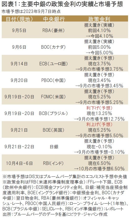 米国では9月6日に発表された米ISMサービス業PMIが54.5となり、市場予想の52.5を上回ったほか、前月の52.7からも上昇した。中でも物価指標の1つとして注目される仕入価格指数は、前月の56.8から58.9へ上昇したことから、サービス業におけるインフレの上振れリスクが再び市場で警戒されている。BCBが長期間にわたって金融引き締め政策を維持したように、FRBも当面、タカ派バイアスを維持することになりそうだ。