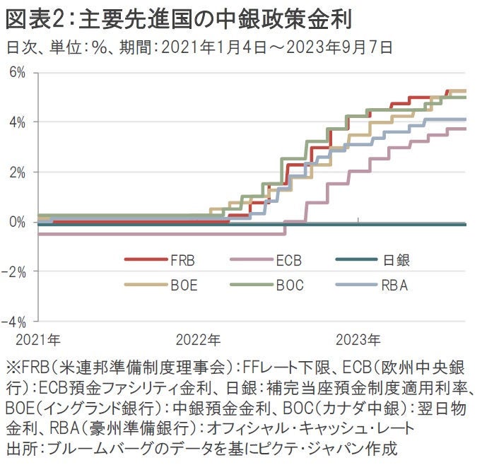 9月5日はRBA(オーストラリア準備銀行)が大方の予想通り政策金利を4.10%で据え置いたほか、9月6日はBOC(カナダ中央銀行)も市場予想通り政策金利を5.00%で据え置いた(図表1)。RBAのロウ総裁は経済やインフレを巡る「見通しにはかなりの不確実性がある」としたほか、豪州でサービス価格インフレが長期化するリスクを強調した。また、BOCは声明文で「経済において過剰需要が和らぎつつある兆候が最近見られる中、金融政策の遅行効果を踏まえ、政策委員会は政策の現状維持を決定した」とした一方、「基調的なインフレ圧力の根強さを引き続き懸念している」とも言及した。いずれの中銀も、状況によっては更なる利上げも辞さない「タカ派バイアス」の据え置きだったと言える。