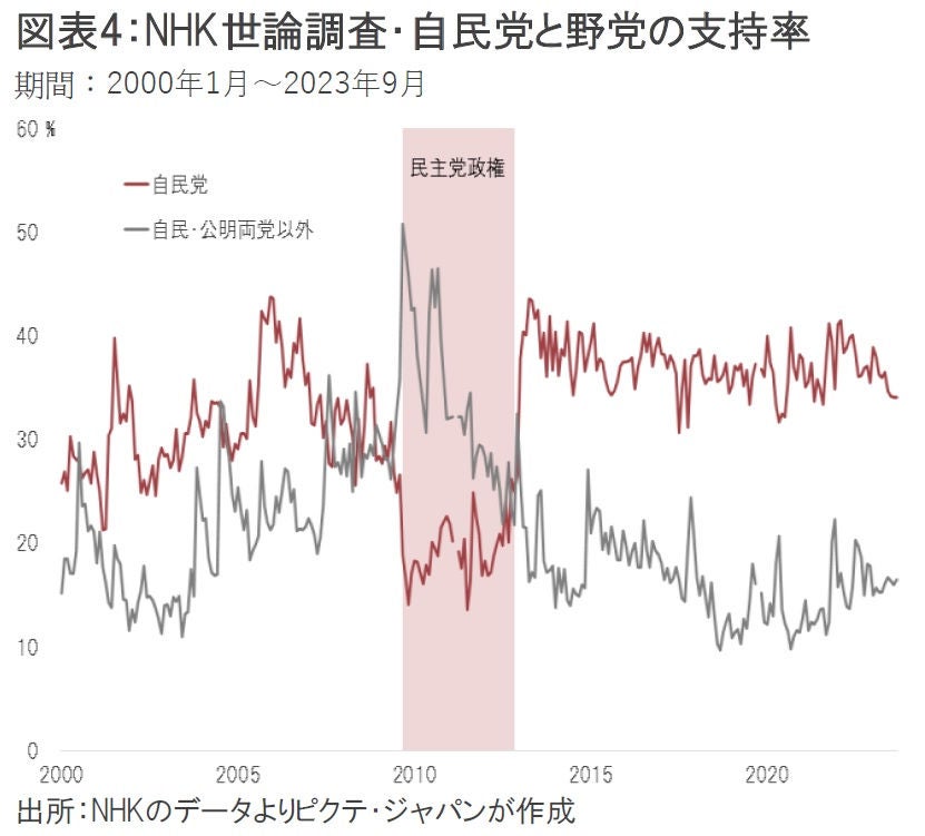 日本経済新聞、読売新聞の8月の調査でも、内閣支持率は下げ止まりの気配を示している。また、NHKの世論調査を見る限り、自民党の支持率は安定しており、野党への期待が盛り上がっているわけではないようだ(図表4)。国民に信を問う上で、悪いタイミングではないだろう。