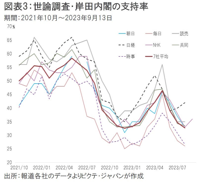 NHKが9月8~10日に行った世論調査では、岸田内閣の支持率は8月を3%ポイント上回る36%になった(図表3)。