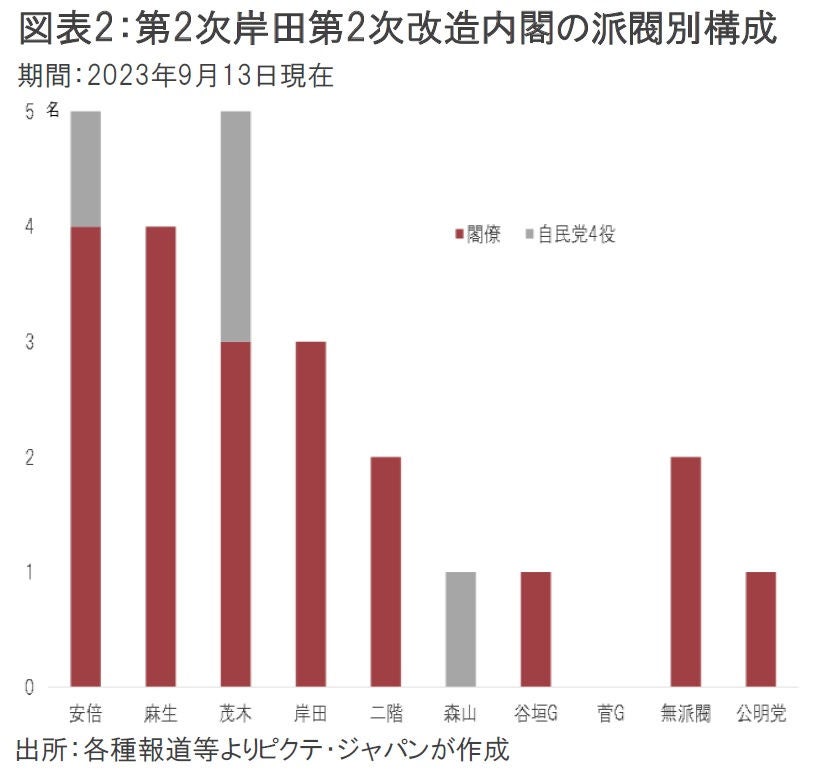 党4役及び閣僚の顔ぶれを見ると、派閥のバランス、安定感、そして新鮮味の何れにも配慮した苦心の形跡が窺われる。例えば、岸田政権を支える安倍派、麻生派、茂木派からは党4役、閣僚が5人ずつが登用された(図表2)。