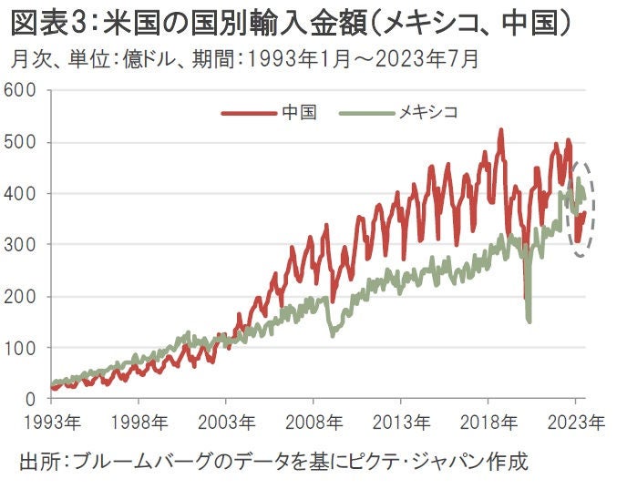 かつて日本と中国の関係は「政冷経熱(政治関係は冷え込んでいるが、経済関係は熱を帯びた状態)」と評されたが、いまや米国と中国の関係は「政冷経冷」に近い。それを象徴するかのように、米国の国別輸入金額の第1位は今年2月以降、中国からメキシコへ取って代わっている(図表3)。