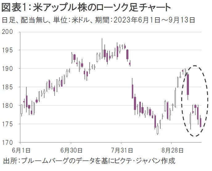 米アップル株は9月6日に前日比3.58%安、7日には同2.92%安と、2日間連続で急落する展開となり、時価総額約28兆円が消失した(図表1)。きっかけは中国政府のiPhone使用禁止報道だ。米国の主要メディアは、中国政府が政府関係者のiPhone使用を一部禁止しているとし、別の主要メディアもその対象が国有企業の従業員にまで広がっていると報じた(その後、中国政府はこの報道を否定)。