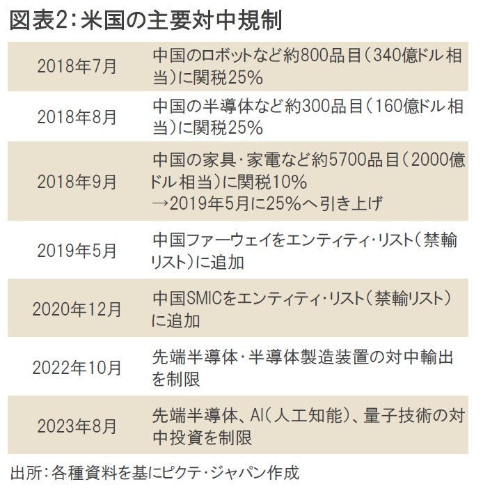 そもそも米国政府は昨年10月に先端技術を使用した半導体・半導体製造装置の対中輸出を規制したほか、今年8月には先端半導体やAI(人工知能)、量子技術にかかる対中投資を厳しく制限する方針を発表していた(図表2)。今回の中国政府によるiPhone使用禁止令は、その報復措置と捉えられる。