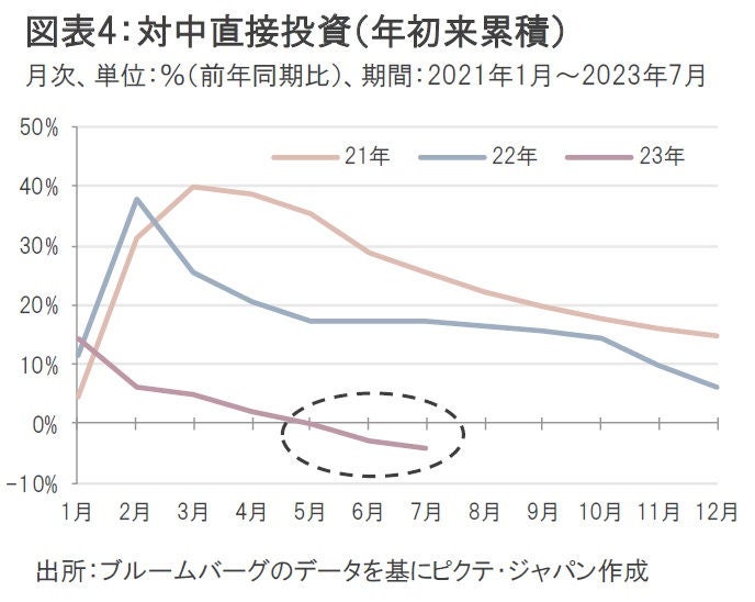 また、海外から中国への対中直接投資(年初来累積)も、23年7月時点で前年同期比マイナス4%と低迷が続く(図表4)。