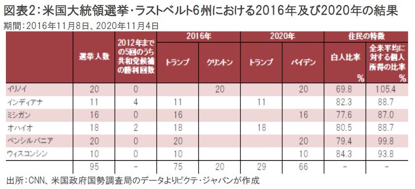 UAWが本部を置くミシガン州デトロイトは、2016、20年の大統領選挙を左右した『ラスト・ベルト』6州の1つだ(図表2)。