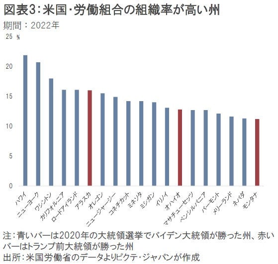 ちなみに、米国の総就業者に占める労働組合加入者は10.6%であり、これを超えたのは19州あった。このうち、ミシガンを含め16州は前回の大統領選挙でバイデン大統領が勝利した州だ(図表3)。