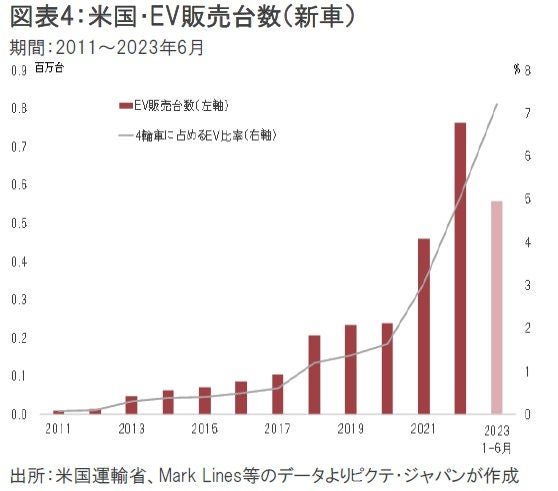 UAWとビッグ3の争議の背景は、インフレと共にEVと言える。今年前半、米国で販売されたEVの新車は60万台に迫り、年間では初めて100万台を超える可能性が強い(図表4)。