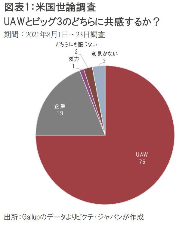 ギャラップが8月に行った世論調査によれば、労働者の処遇を巡る今回の争議について、UAWに共感するとの回答は75%に達した(図表1)。