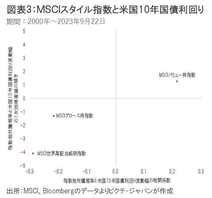 統計的に見ると、2000年代に入り、グロース株指数の対世界指数相対騰落率には、米国10年国債の利回りの変化に対して弱いながらも負の相関関係が見られた(図表3)。高配当銘柄は、その傾向がより顕著と言えよう。グロース、高配当は、金利低下局面でアウトパフォームするのである。