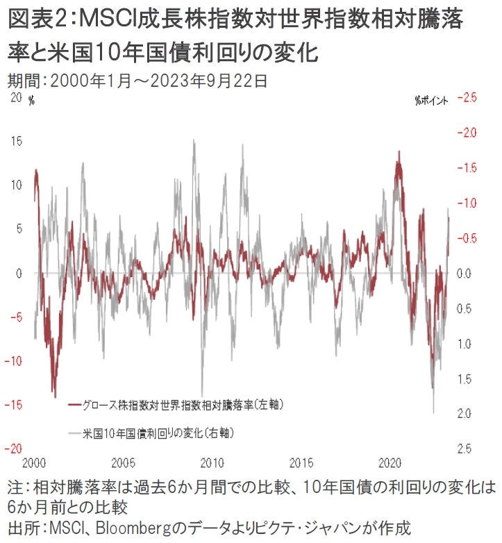 ちなみに、MSCIのグロース株指数の対世界指数相対騰落率は、米国の10年国債の利回りの変化に連動する傾向がある(図表2)。