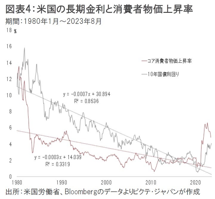 1991年12月の旧ソ連崩壊以降、米国をリーダーとして市場の統合、即ちグローバリゼーションの時代が30年間に亘って続き、物価の安定がもたらされたことで、米国の長期金利はトレンドとして低下した(図表4)。従って、グロース株は趨勢的に市場をアウトパフォームできたのだろう。