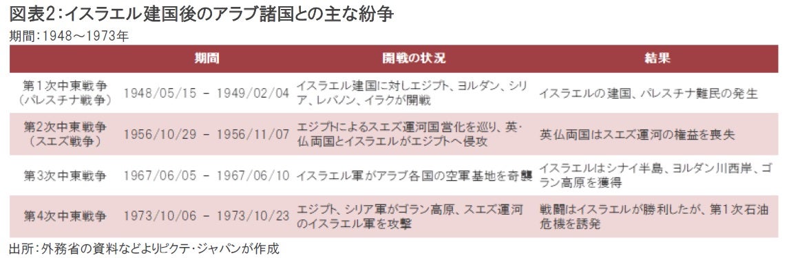 もっとも、同決議に対するアラブ側の不満により、これまで4次にわたる中東戦争が勃発した(図表2)。