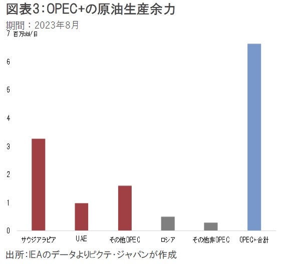 国際エネルギー機関(IEA)によれば、8月、サウジアラビアの産油量は日量900万bblだった。これは、OPEC+の生産割当量を150万bbl下回るだけでなく、同国の持続可能な生産水準との乖離が330万bblに達したことを意味する(図表3)。つまり、サウジアラビア1国で、日本の消費量に匹敵する程度の増産余力があるわけだ。