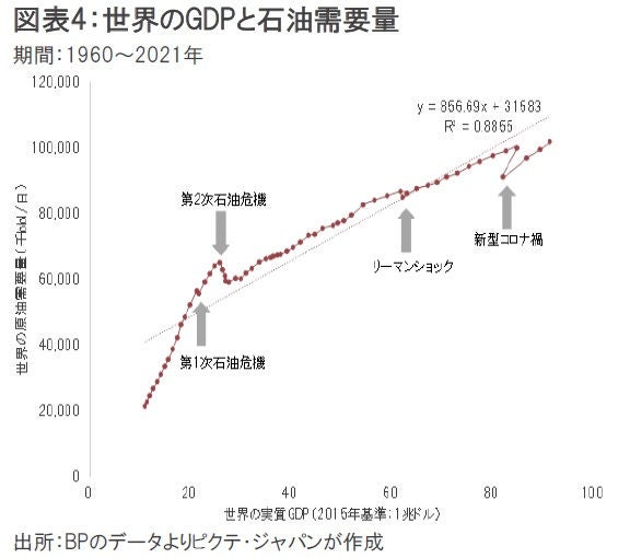 1973~75年の第1次石油危機は、1960年代の高度経済成長期を経て、主要国が急速なエネルギー需要の拡大期にあったからこそ、価格の上昇を通じて世界経済に大きな打撃を与えた(図表4)。ファンダメンタルズ面から見れば、旺盛な需要に供給力が追い付いていなかったのである。