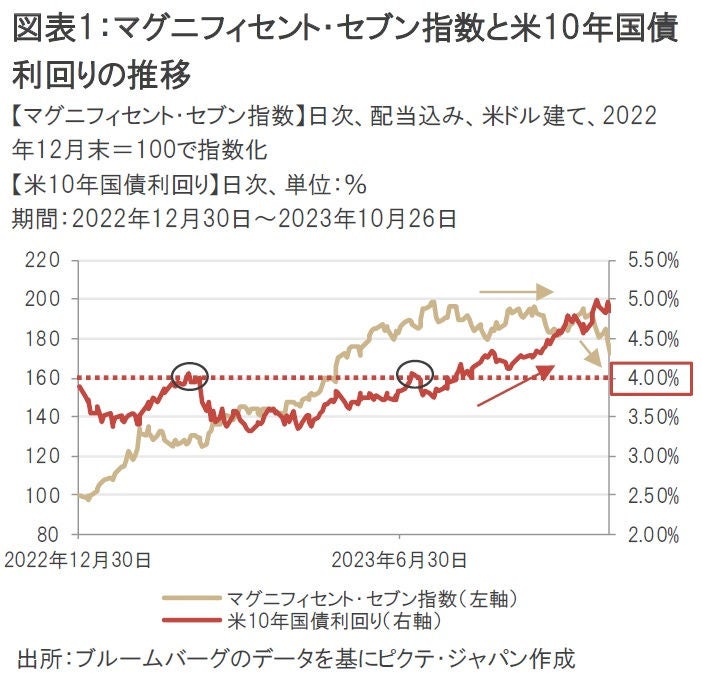 年初来で米国株式市場の上昇をけん引してきた超大型成長株の値動きが冴えない。きっかけは米10年国債利回りの急上昇だ。アップル、マイクロソフト、アマゾン・ドットコム、エヌビディア、アルファベット、メタ・プラットフォームズ、テスラの超大型成長株7銘柄で構成されるマグニフィセント・セブン(壮大な7銘柄)指数は今年8月ごろから軟調に推移しており、ちょうど米10年国債利回りが4.0%を超えたタイミングと重なる(図表1)。