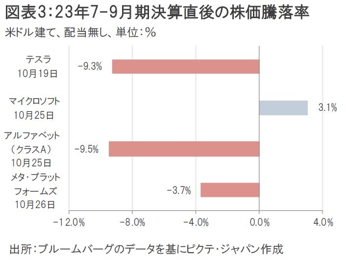 さらに追い打ちをかけたのが23年7-9月期の決算だ。先陣を切ったのは10月18日に決算を発表したテスラ。23年7-9月期決算の1株当たり利益(EPS)は市場予想を下回り、注目された「サイバートラック」の黒字化には長い時間がかかるとしたことなどから、翌日の株価は前日比9.3%下落した。一方、10月24日引け後に発表されたマイクロソフト決算では23年7-9月期EPSが市場予想を上回り、生成AIの早期収益化を印象付けたことなどから、翌日の株価は同3.1%上昇した。だが、同日引け後に発表されたアルファベット決算は23年7-9月期EPSこそ市場予想を上回ったものの、生成AI需要等がけん引するクラウドコンピューティング部門の営業利益が市場予想を下回ったことなどが嫌気され、翌日の株価(クラスA)は同9.5%も急落した。さらに、10月25日引け後に発表されたメタ・プラットフォームズ決算も23年7-9月期EPSが市場予想を大きく上回ったが、決算発表会見で同社の最高財務責任者(CFO)が24年の収入見通しが不透明だとコメントしたため、翌日の株価は同3.7%下落した(図表3)。