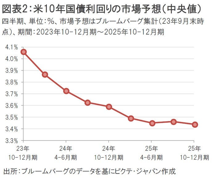 おそらく金融市場では米10年国債利回りの「天井」 が4.0%だという暗黙のコンセンサスが形成されていた可能性がある。実際、ブルームバーグが集計した23年9月末時点における米10年国債利回りの市場予想(中央値)は、23年10-12月期の4.1%がピークでその後は緩やかに低下する見通しとなっていた(図表2)。