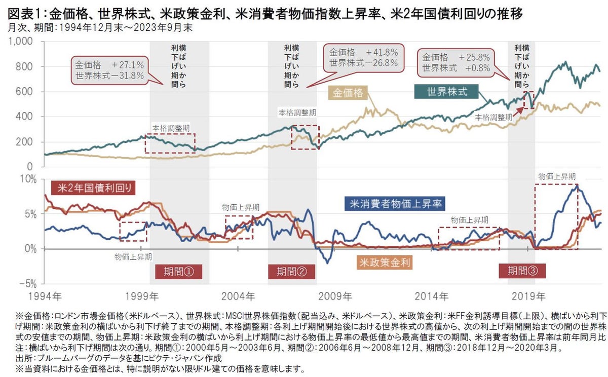 もしすでに利上げサイクル終了前後の時期にあると考えると、過去、この時期から金価格が上昇する傾向にあったこと、またこの期間の前後どこかで世界株式が本格調整期を迎えたことを考えると、株式と異なるパフォーマンスを示してきた金は、分散投資の一助となる可能性が高いと考えられる。