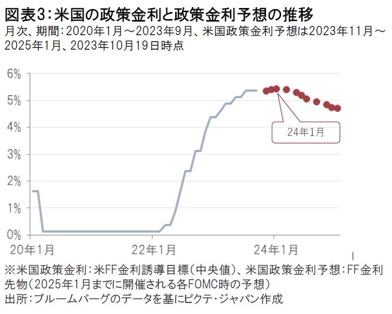 FF金利先物が織り込む市場参加者の予想は(23年10月19日時点)、24年1月FOMC時点の政策金利予想が最高水準となっている(図表3参照)。ただし、その時点においても予想されている利上げ回数は0.4回(0.25%を1回と想定)相当となっている。今後の経済成長率やインフレ関連の経済統計によりこの見通しは変化する可能性は十分にあるものの、すでに利上げサイクルの最終局面にあると考えることはできよう。