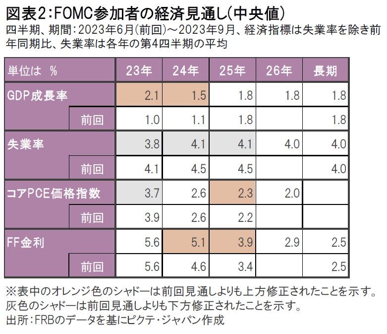 米連邦準備制度理事会(FRB)は2023年9月19-20日に開催した米連邦公開市場委員会(FOMC)で市場予想通り、政策金利にあたるフェデラル・ファンド(FF)金利を据え置いた。9月のFOMC参加者の経済見通し(中央値)を見ると、23年末のFF金利見通しは5.6%と、あと1回の利上げを示唆しており6月から変化はなかった。一方で、24年、25年末のFF金利については、それぞれ5.1%、3.9%と政策金利の引き下げが実施される見通しとなっている。つまり金融政策当局者の見通しの中央値は、23年末から24年にかけてどこかで利上げサイクルが終了することを示唆している。