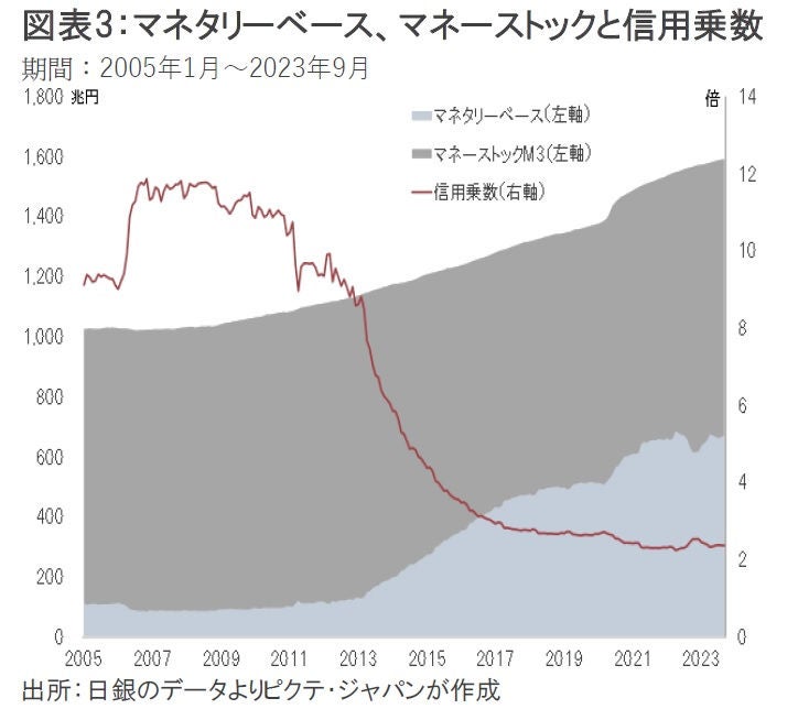 ところが、2013年3月に8.50倍だった信用乗数(m)は、量的・質的緩和の拡大に伴って低下を続け、9月には2.38倍になっている(図表3)。