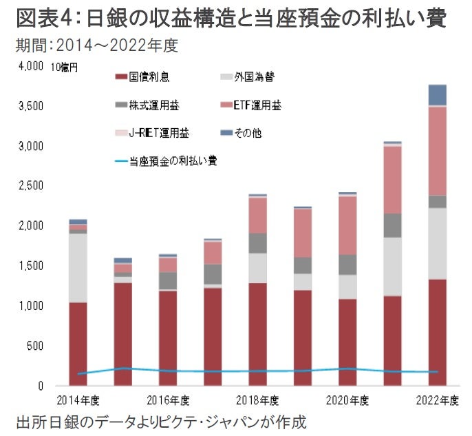 日銀が当座預金の付利金利を引き上げ、超過準備の取り崩しに抗うには大きな課題がある。日銀自身の利払い費が急増し、経常収入を大きく超えてしまうリスクだろう(図表4)。