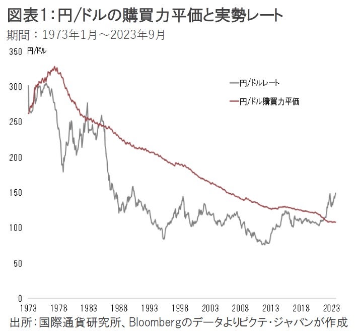 円のドルに対する購買力平価は概ね105~115円と推計されている(図表1)。