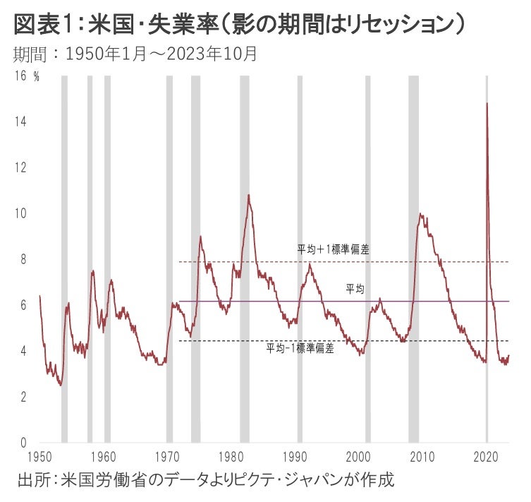 もっとも、求人及び労働移動統計(JOLT)によれば、9月の求人は前月より5万6千人多い955万3千人、求職者とのギャップは総労働力人口の1.9%に達した。米国では人手不足が続いている。バイデン政権は来年の大統領選挙を睨んで不法入国者の取り締まりを強化しており、労働需給の緩和による失業率の急上昇は考え難い。個人消費がGDPの7割弱を占める米国では、景気後退局面では例外なく失業率が急上昇した(図表1)。