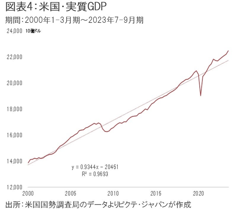 ちなみに、2000~2019年までの20年間、米国の平均実質成長率は2.1%だ(図表4)。2021年の5.8%は新型コロナによりマイナス成長となった前年の反動だが、2022年以降も均せば2.0%の成長を維持している。こうしてトレンドを冷静に見る限り、米国景気は堅調に推移していると言えよう。