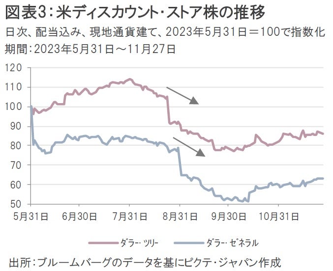 一方、日本の100円ショップに相当する米ダラー・ゼネラルや米ダラー・ツリーの株価も冴えない(図表3)。米政府のコロナ給付金等によって積み上がった過剰貯蓄が取り崩される中、金利高や物価高による影響が家計を圧迫する。ダラー・ゼネラルは今年3月16日に23年度通期の業績見通しを公表した後、3度(6月1日、8月31日、10月12日)にわたって業績見通しを下方修正しており、事業環境が急速に悪化していることがうかがえる。