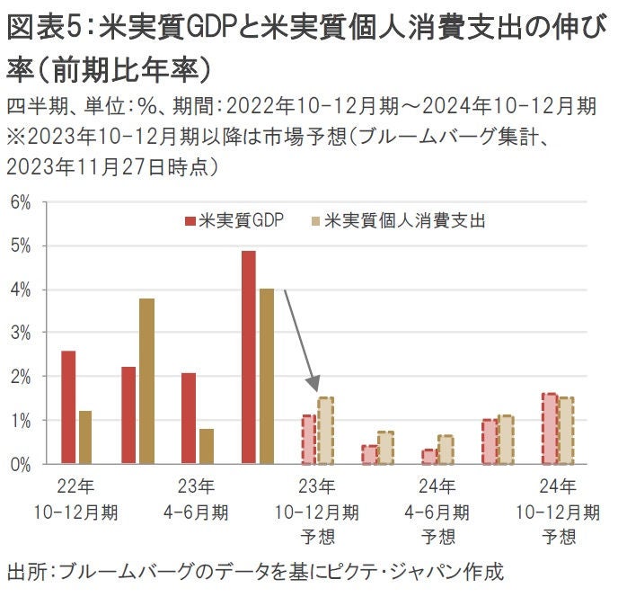 23年10-12月期の米実質GDP成長率もいまのところ急減速することがコンセンサスだ。23年7-9月期の米実質GDP成長率は前期比年率+4.9%と非常に高い伸び率を示したが、これが23年10-12月期には同+1.1%へ急減速する見込みだ。主因は実質個人消費支出の鈍化であり、23年7-9月期の同+4.0%から23年10-12月期は同+1.5%になると予想されている(図表5)。