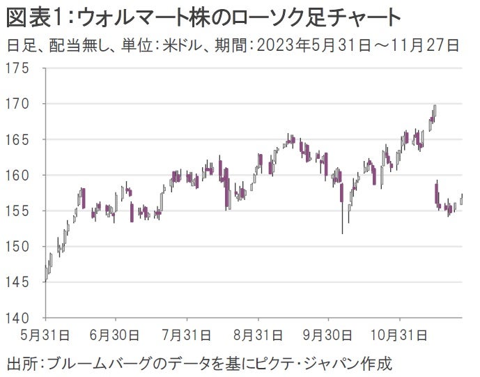 米小売最大手ウォルマートの株価が足元で急落している。きっかけは11月16日に行われた23年8-10月期決算発表後の記者会見だ。同社最高財務責任者(CFO)のジョン・デービッド・レイニー氏は10月後半に米国の個人消費が軟調になったと明かし、「90日前と比較して個人消費の動向にやや慎重になった」と語った。23年8-10月期の調整後EPSは市場予想を上回り、通期の調整後EPS見通しも引き上げたにもかかわらず、当日の株価は前日比8.09%安となった(図表1)。