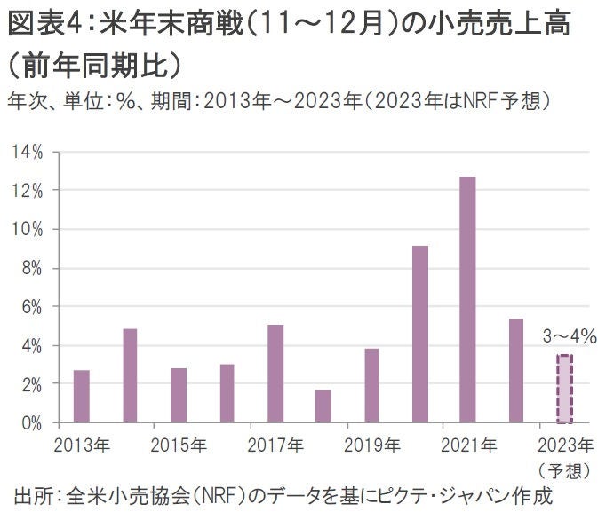 今年の米年末商戦は低調になると予想されている。全米小売協会(NRF)は23年11~12月の米小売売上高を前年同期比3~4%増と、昨年の同5.4%増から減速すると見込んでいる。NRFはインフレ調整を行っていないため、物価上昇率を差し引けば実質的な小売売上高の伸び率はほぼ横ばいになりそうだ(図表4)。