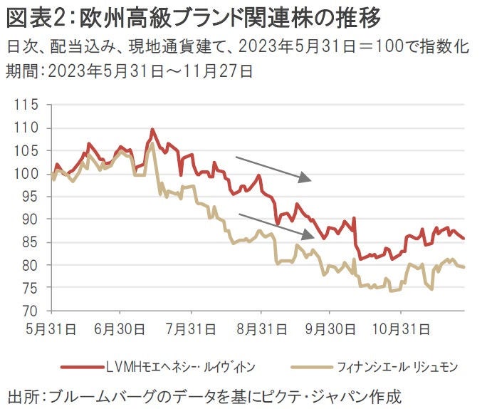 株安はウォルマート株に限ったことではない。高級ブランド品を手掛けるフランスのLVMHやスイスのフィナンシエール・リシュモンの株価は、今年7月ごろから下落基調となっている(図表2)。共通する要因は、中国の先行き不透明感と米国の景気失速懸念だ。特に米国は主要各国に先駆けてコロナ禍から脱却したこともあり、高級ブランド品などのリベンジ消費が先んじてピークアウトしつつある。LVMHが開示した23年1~9月の米国売上高は前年同期比+3%と、22年1~9月の同+19%から急減速したことがそれを物語る。