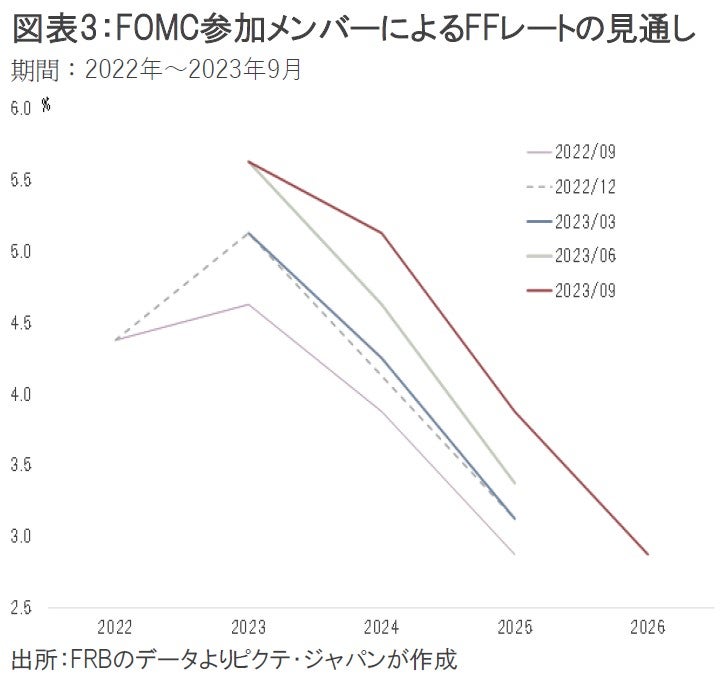3回連続で政策金利の据え置きが見込まれるなか、来週のFOMCで注目されるのは、参加者19人による経済見通しだ。9月の段階で、2023年末のFFレートの中央値は5.50~5.75%、2024年末はそこから2回利下げした5.00~5.25%だった(図表3)。実際は5.25~5.50%が天井だろう。