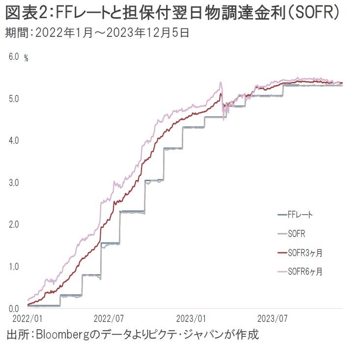 今回の利上げ局面において、FRBは様々なチャンネルを通じて市場との対話に腐心してきた。その結果、指標となる翌日物調達金利(SOFR)は、シカゴマーカンタイル取引所(CME)が算出する1、3、6ヶ月物の先物を含め、FOMC前に利上げをほぼ正確に織り込んでいる(図表2)。
