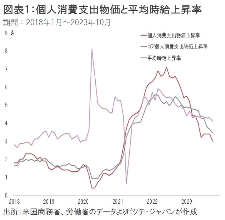 この講演に先立つ11月30日に発表された10月の個人消費支出(PCE)物価指数は、総合指数が前年同月比3.0%、コア指数が同3.5%の上昇だった(図表1)。原油などエネルギー価格が下落、物価を押し上げているのは主に賃金となり、パウエル議長が指摘した通り、実質賃金の伸びはプラスになっている。これは、金融政策が基本的に意図した方向へ経済を導いていることを示すだろう。