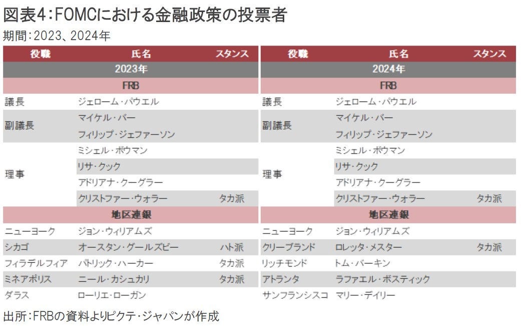 ちなみに、FOMCで金融政策の決定に投票権をもつのは、議長、副議長2人を含むFRBの理事7名、ニューヨーク連銀総裁、残り11の地区連銀から輪番で4名、計12名だ。今年の投票権者の姿勢を見ると、FRBのクリストファー・ウォラー理事、フィラデルフィア連銀のパトリック・ハーカー総裁、ミネアポリス連銀のニール・カシュカリ総裁がタカ派、シカゴ連銀のオースタン・グルーズビー総裁はハト派として認識されてきた(図表4)。