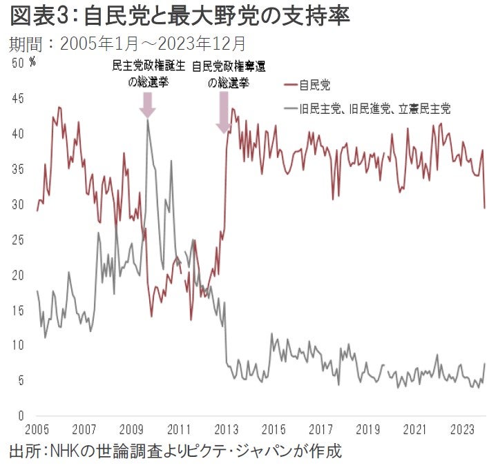 また、2009年8月30日に行われた総選挙で自民党が大敗して下野した際には、参議院選挙において民主党が圧勝した2007年7月の時点で、同党の支持率がNHKの世論調査で20.5%に達していた(図表3)。当時の自民党の支持率は31.8%でまだ10%ポイントの差はあったものの、そこから急速に両党の支持率は接近している。